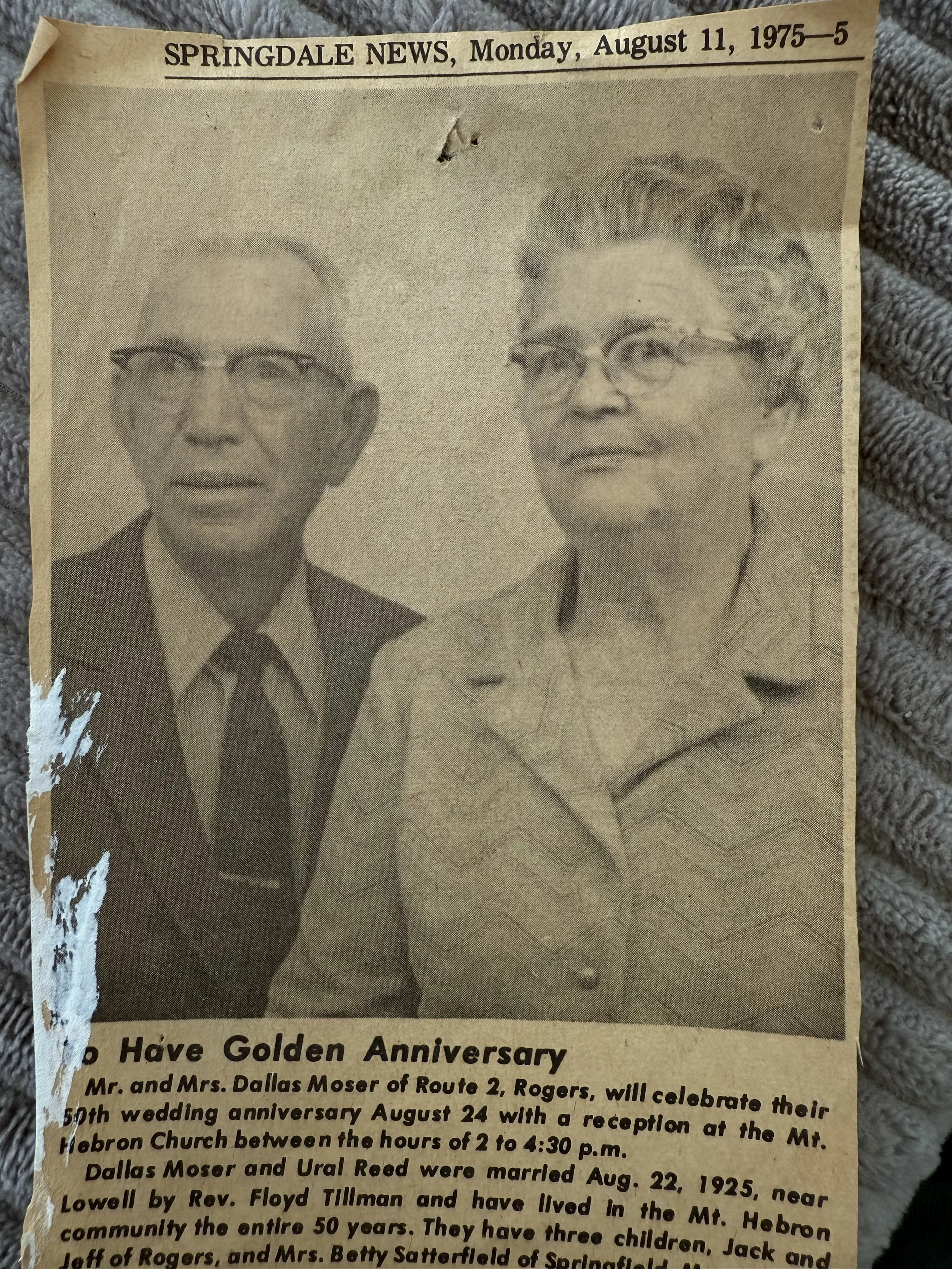 Dallas Moser was born 8/18/1904. Ural was born 7/8/1905. They were married on 8/22/1925 near Lowell.